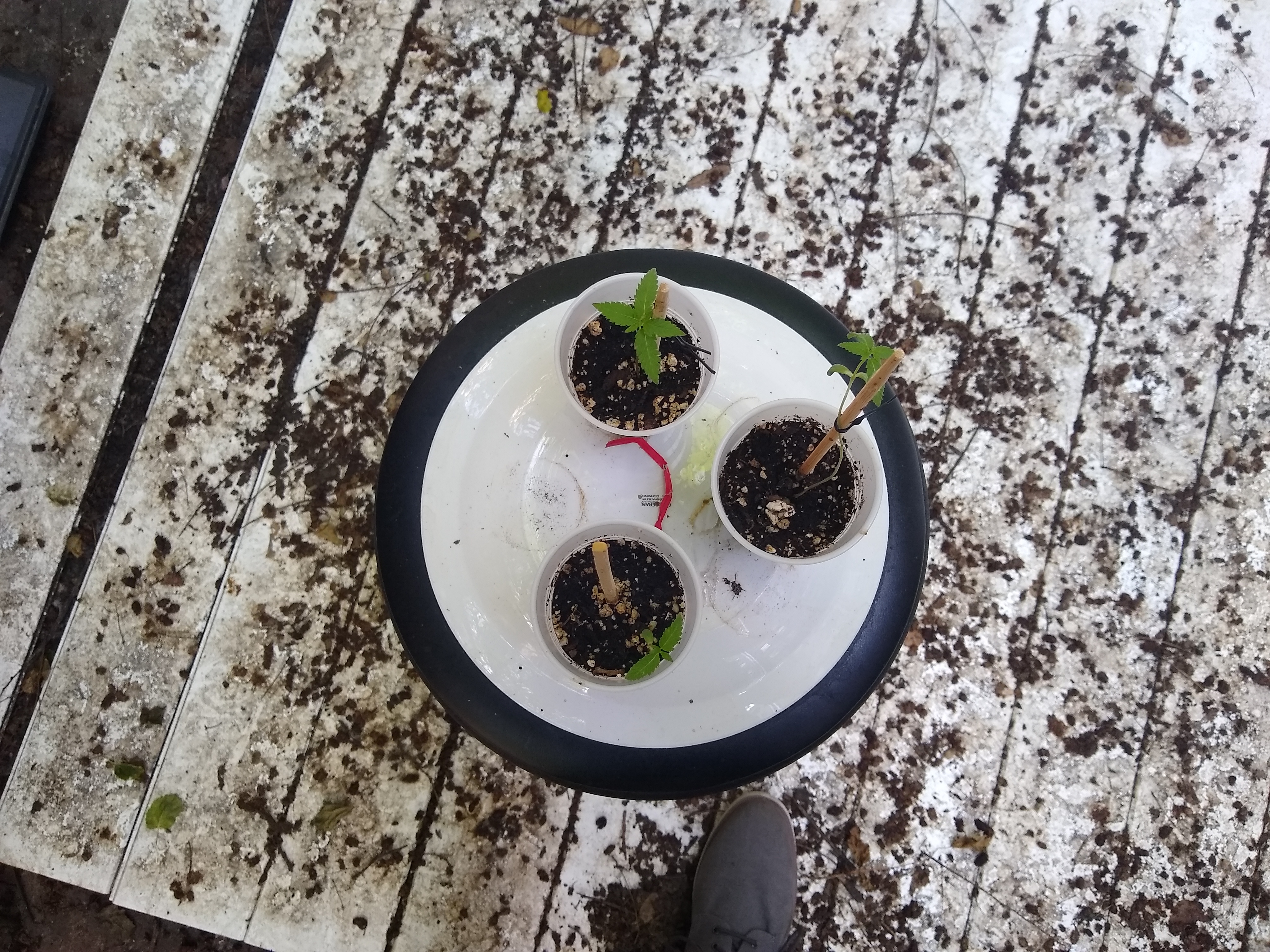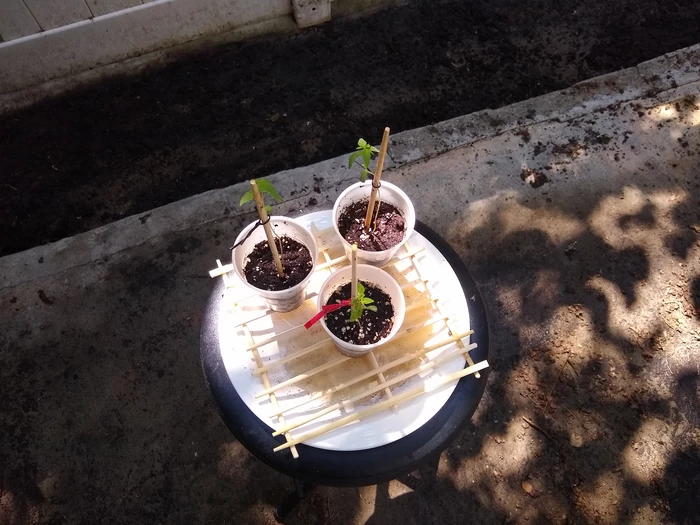 Two of the plants never "opened up" to produce leaves, and so died. I put the surviving three out back on a stool to grow in partial shade until they were mature enough to transplant into larger pots.