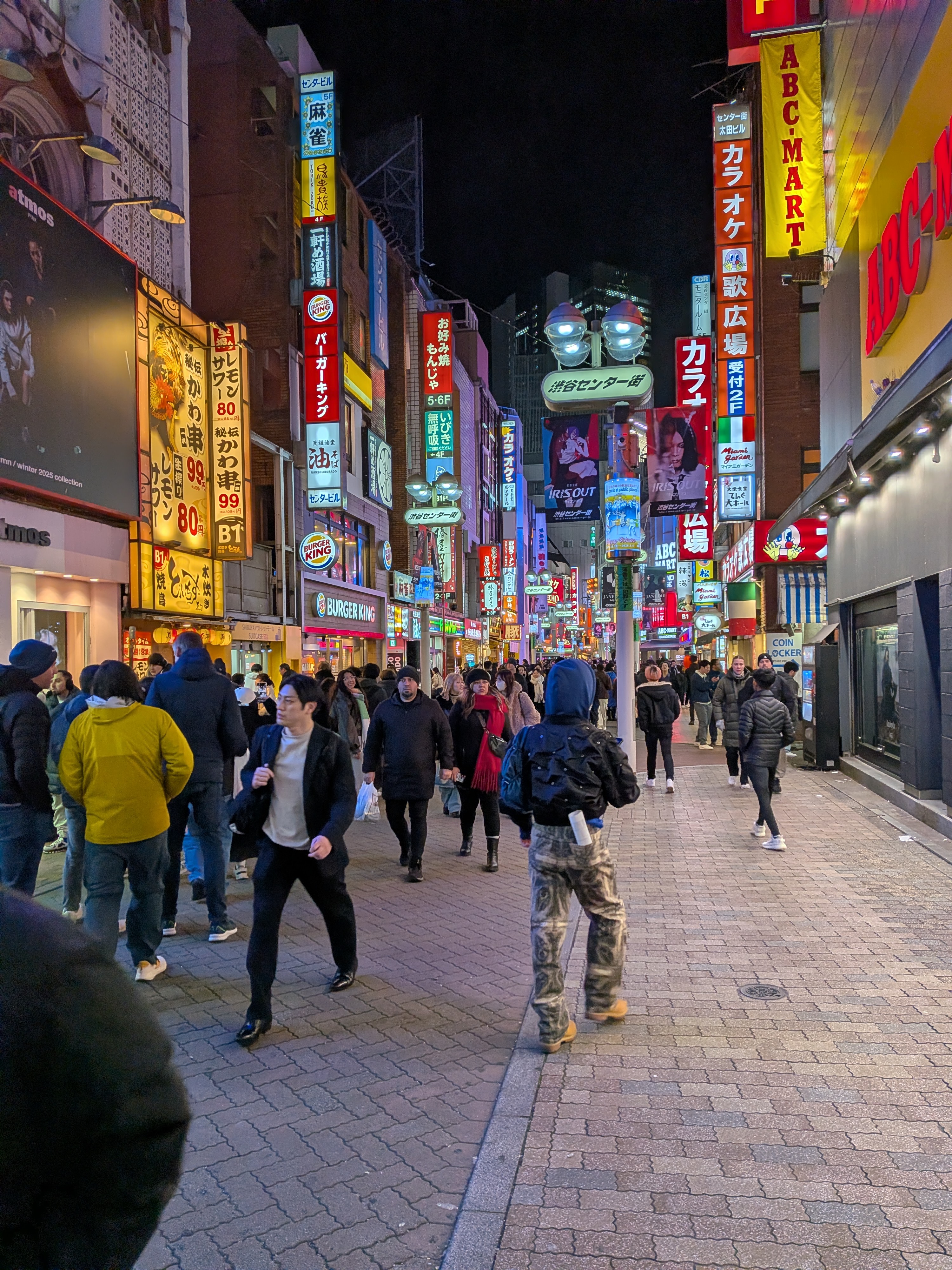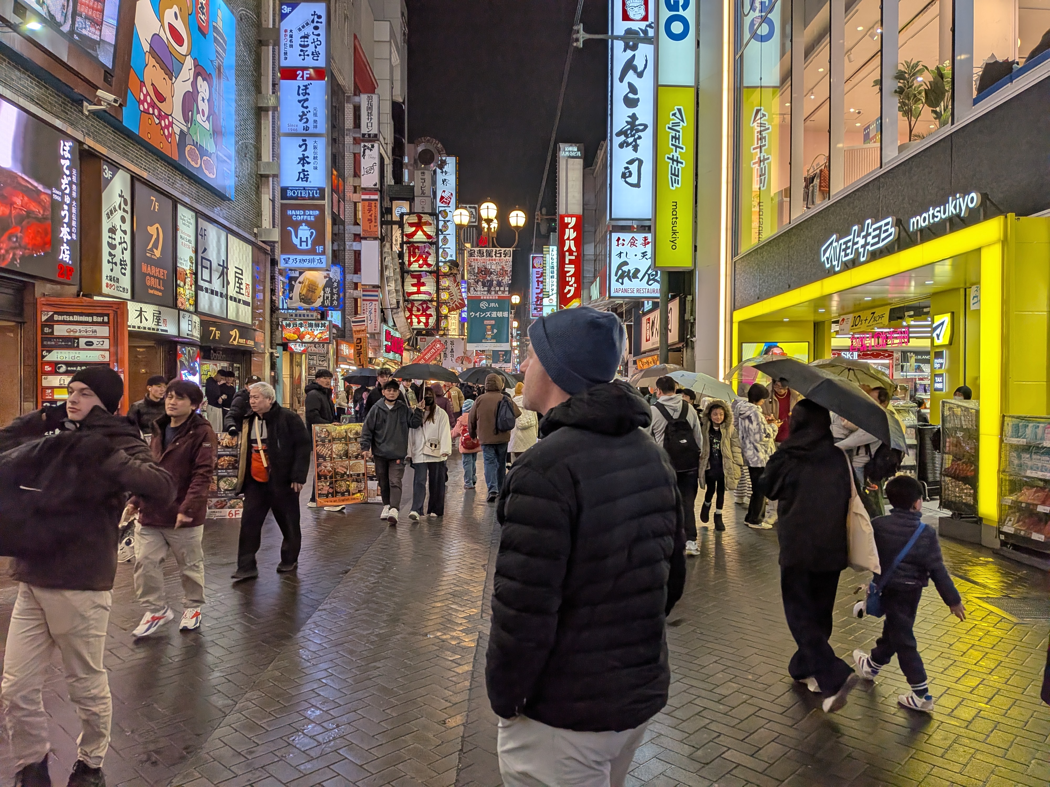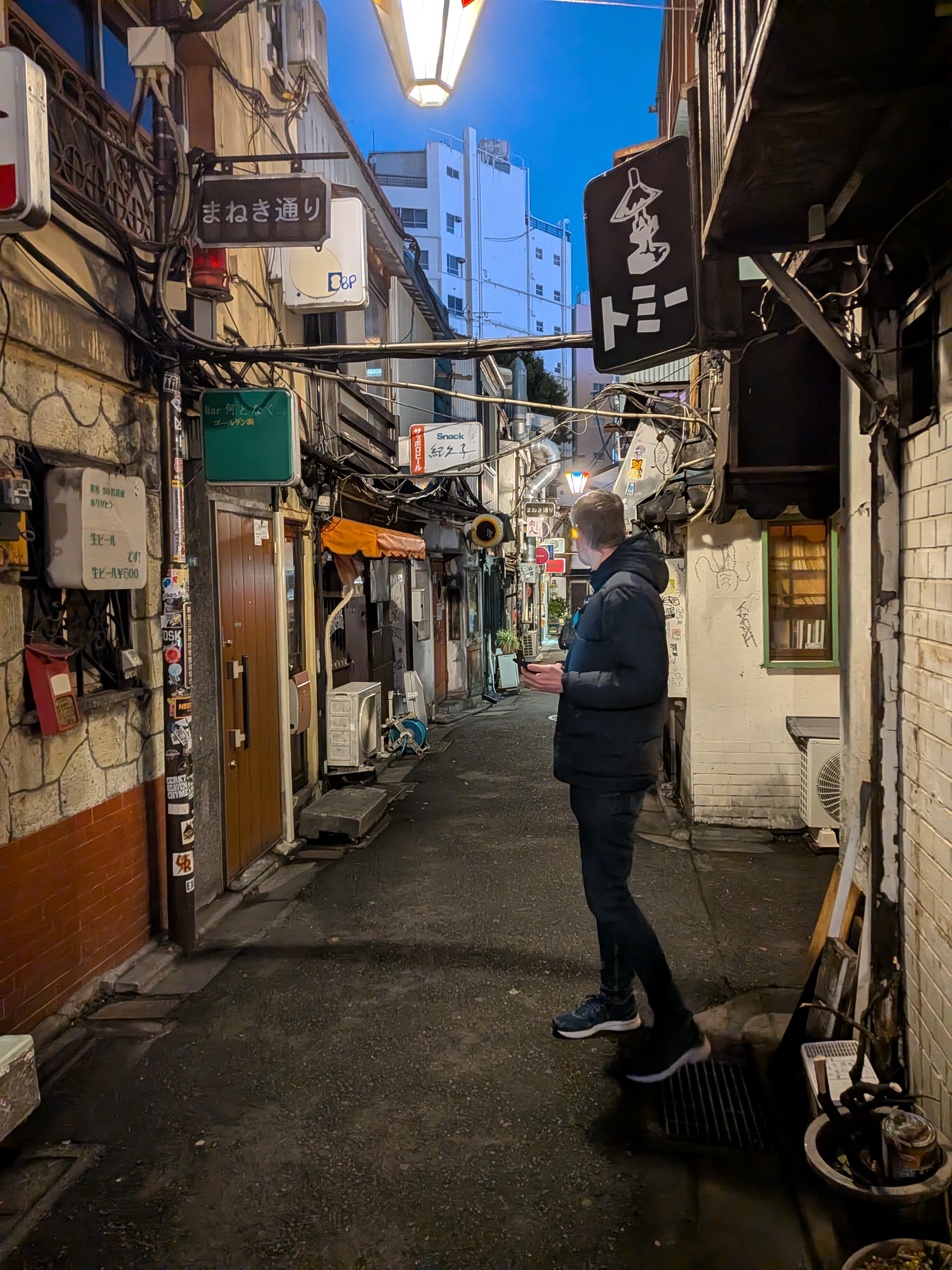 That's Pasha walking through Golden Gai around sunset. That area is neat, I remember Zach telling me about it. There are tons of tiny bars. Each bar can sit maybe five people, has one bartender, and sometimes a toilet. Maybe it's like being below deck on a small pirate ship. Smoking is allowed. One bartender was a drummer in a J-pop band. He learned English by doing Duolingo. We met an Englishman and his girlfriend. Next door, the bartender spoke perfect English and presided over a bar full of Americans, save for the Japanese guy to my left with a passion for racecars.