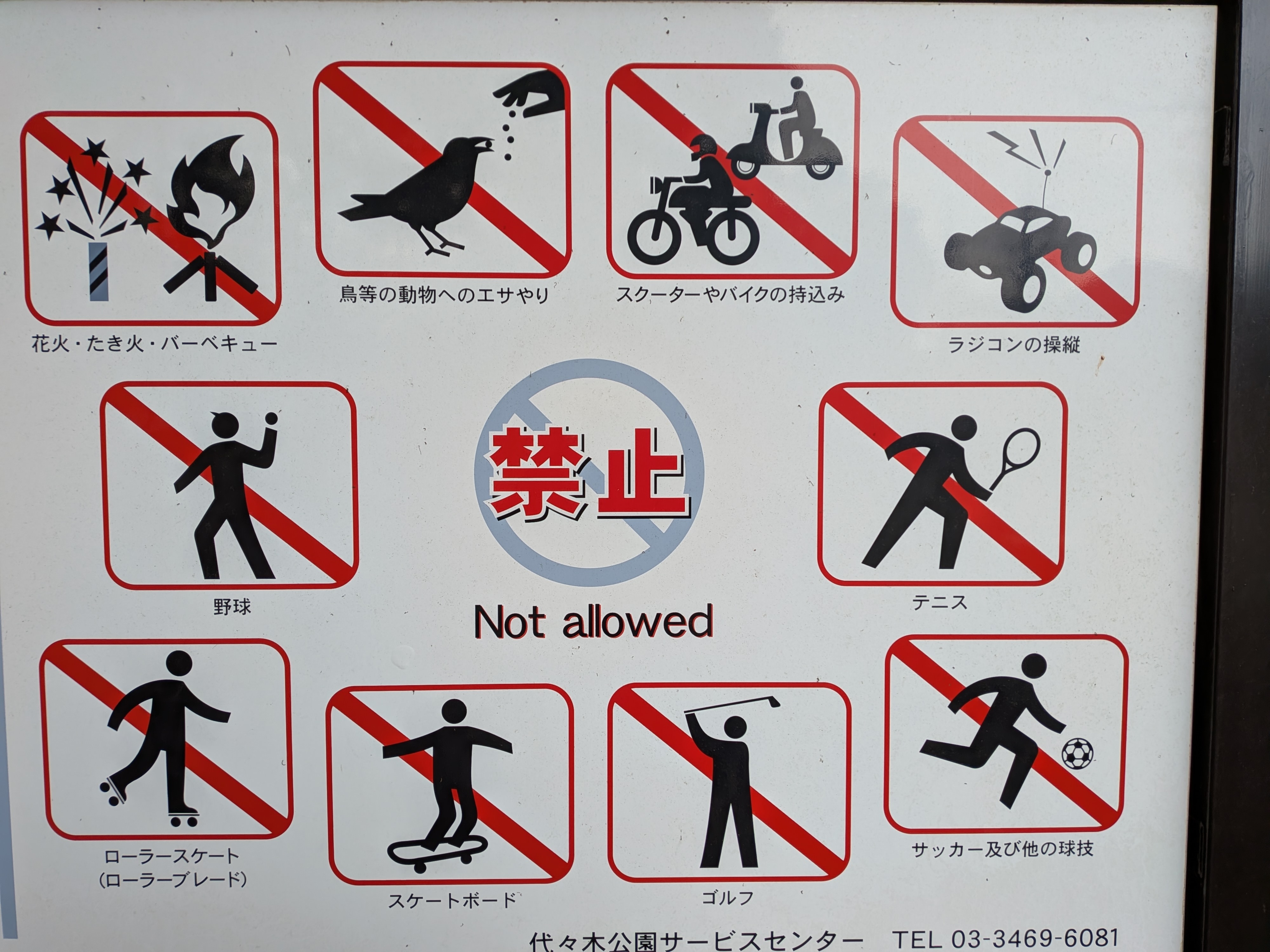 There is also no lighting of fireworks or campfires, no feeding of crows, no motorcycles or mopeds, no remote controlled toy cars, no wielding of rackets, no kicking of soccer balls, no swinging of golf clubs, no riding of skateboards, no wearing of roller skates, and no throwing of round objects while wearing a billed hat.