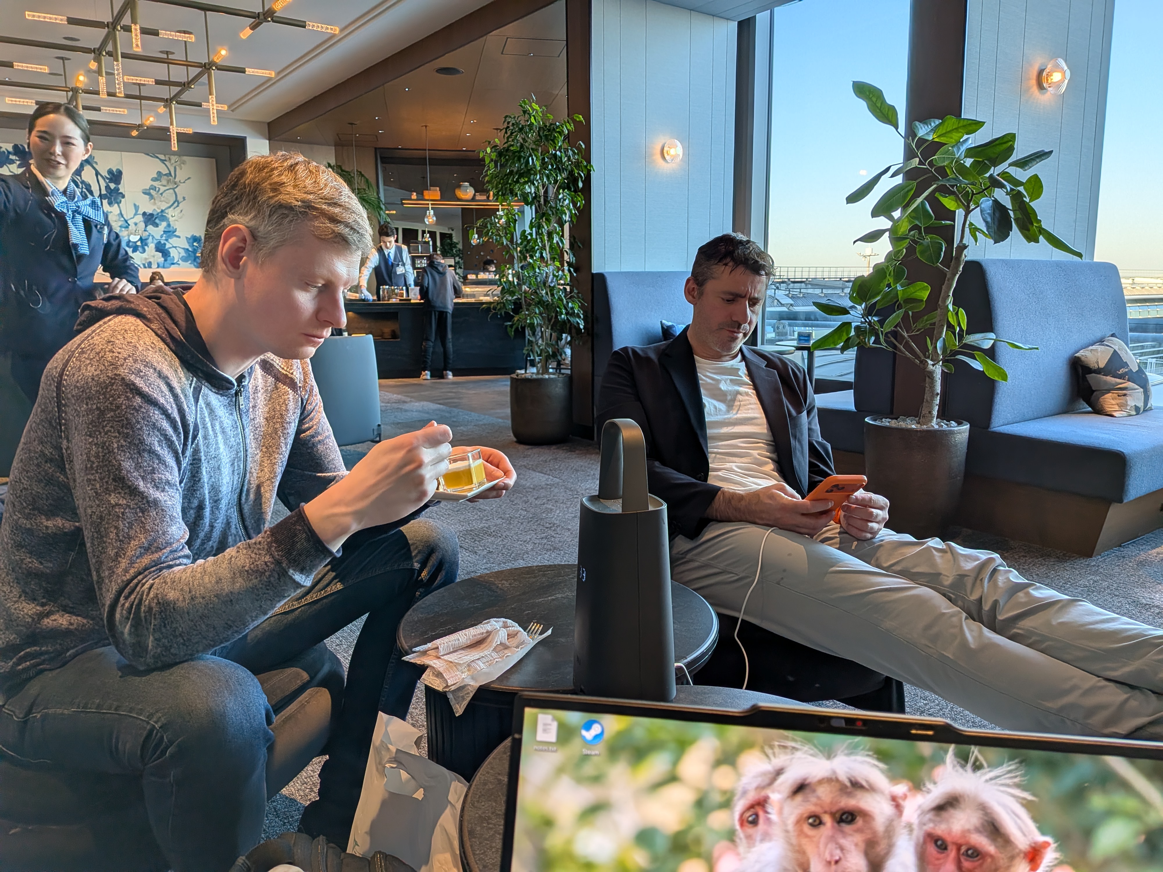 Sasha has access to American Express's premium airport lounge, where we camped out until our delayed flight was finally ready for boarding.