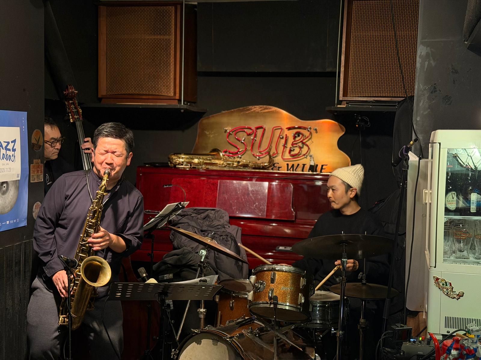Christmas Eve we went to a really very tiny jazz cafe where the owner/bartender/cook/host picked up his sax to play with a drummer who I think I recognize from New York and a bass player almost hidden from view.